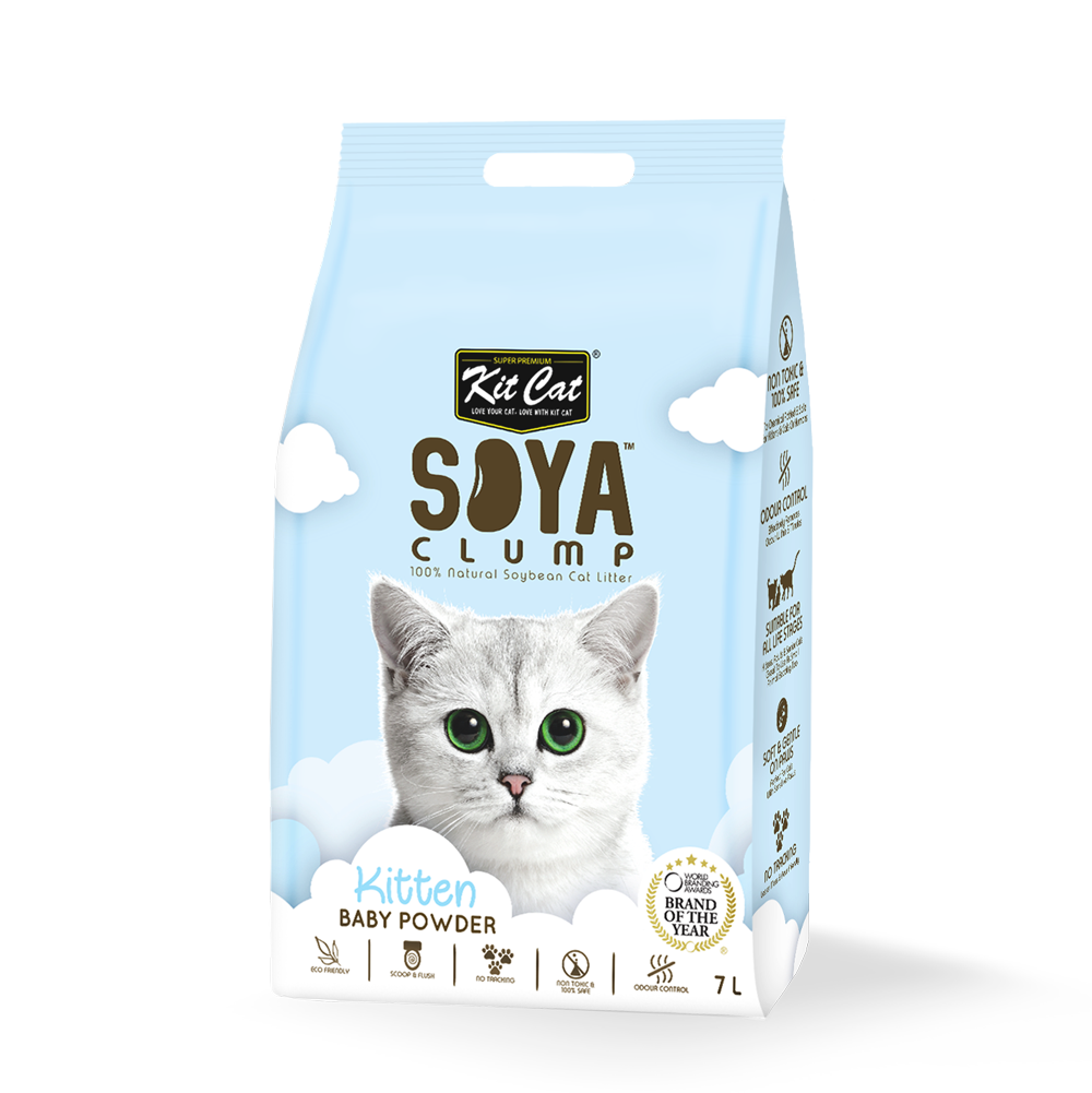 - Kit Cat® Soya Clump™ is a 100% biodegradable soy-based cat litter with mild aroma. This unique product is made from the insoluble parts of a soybean which is found in soy milk production. Normally these insoluble parts are mainly disposed of in a landfill, but Kit Cat® innovates a second purpose for this "wasted" material to be used as a cat litter, labelling us as Eco-Friendly. Works as an excellent liquid absorbent as it can take up moise up to 3 times more compared to traditional clay/crystal litter. With an instant clumping formula, it clump upon contact with fluid.