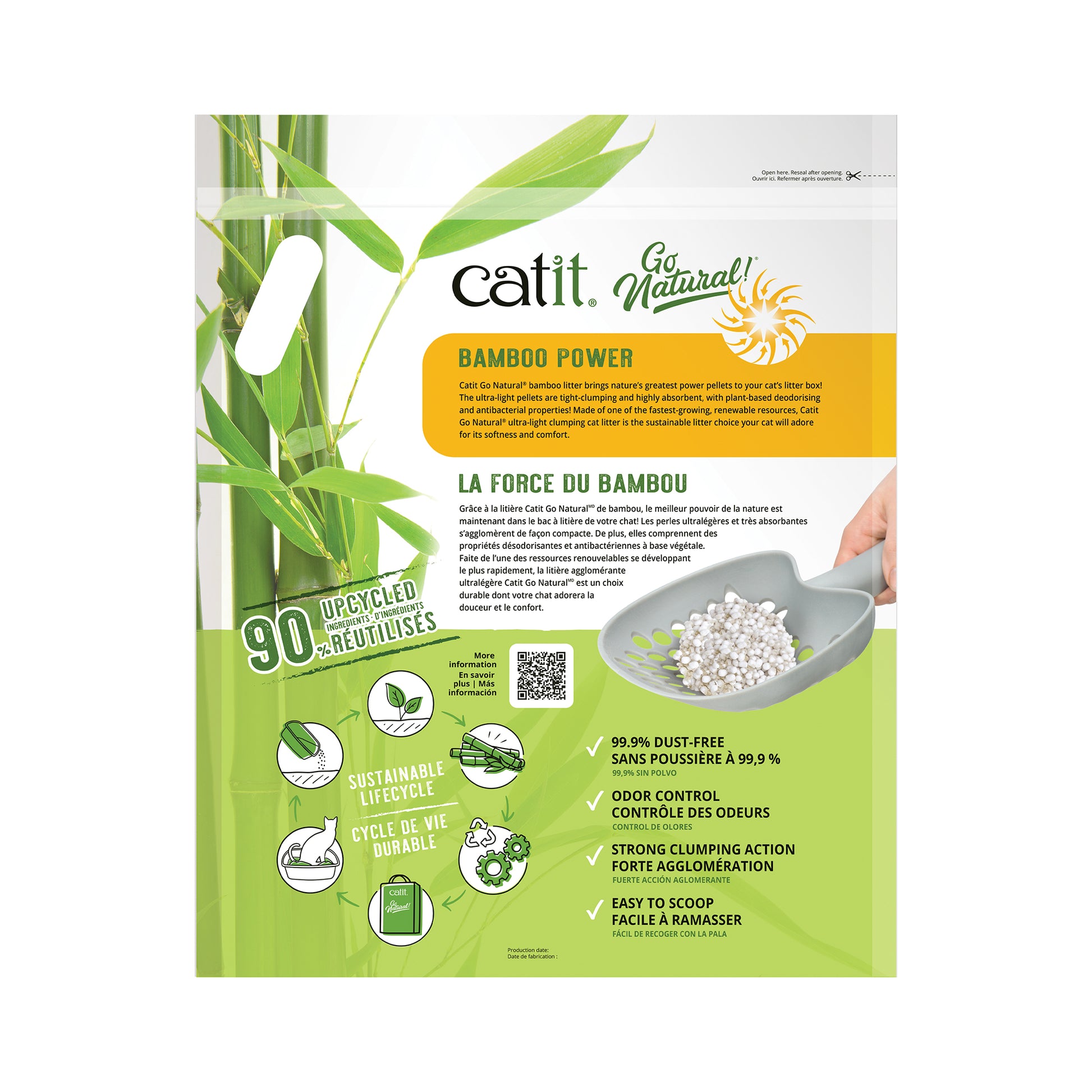Catit Go Natural! Ultra-Light Clumping Cat Litter is a high-performing, eco-friendly litter made from natural bamboo fibers and sugar cane pulp (bagasse), both upcycled post-consumer materials. Its smooth, soft pellets provide a pleasant experience for your catโs paws while offering strong clumping action for easy cleaning.