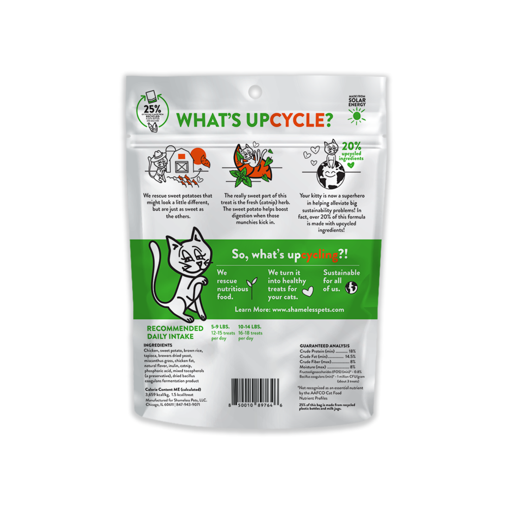- Ingredients: chicken, sweet potato*, brown rice, tapioca, brewers dried yeast, miscanthus grass, chicken fat, natural flavor, inulin, catnip, phosphoric acid, mixed tocopherols (a preservative), dried bacillus coagulans fermentation product * Upcycled Ingredient