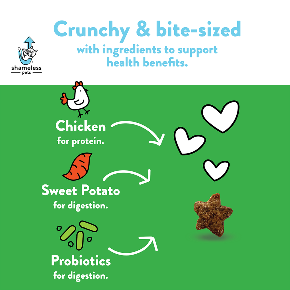 - These crunchy, star-shaped, bite-sized treats are made with chicken, sweet potatoes, catnip along with both pre & probiotics, which helps to support digestion!