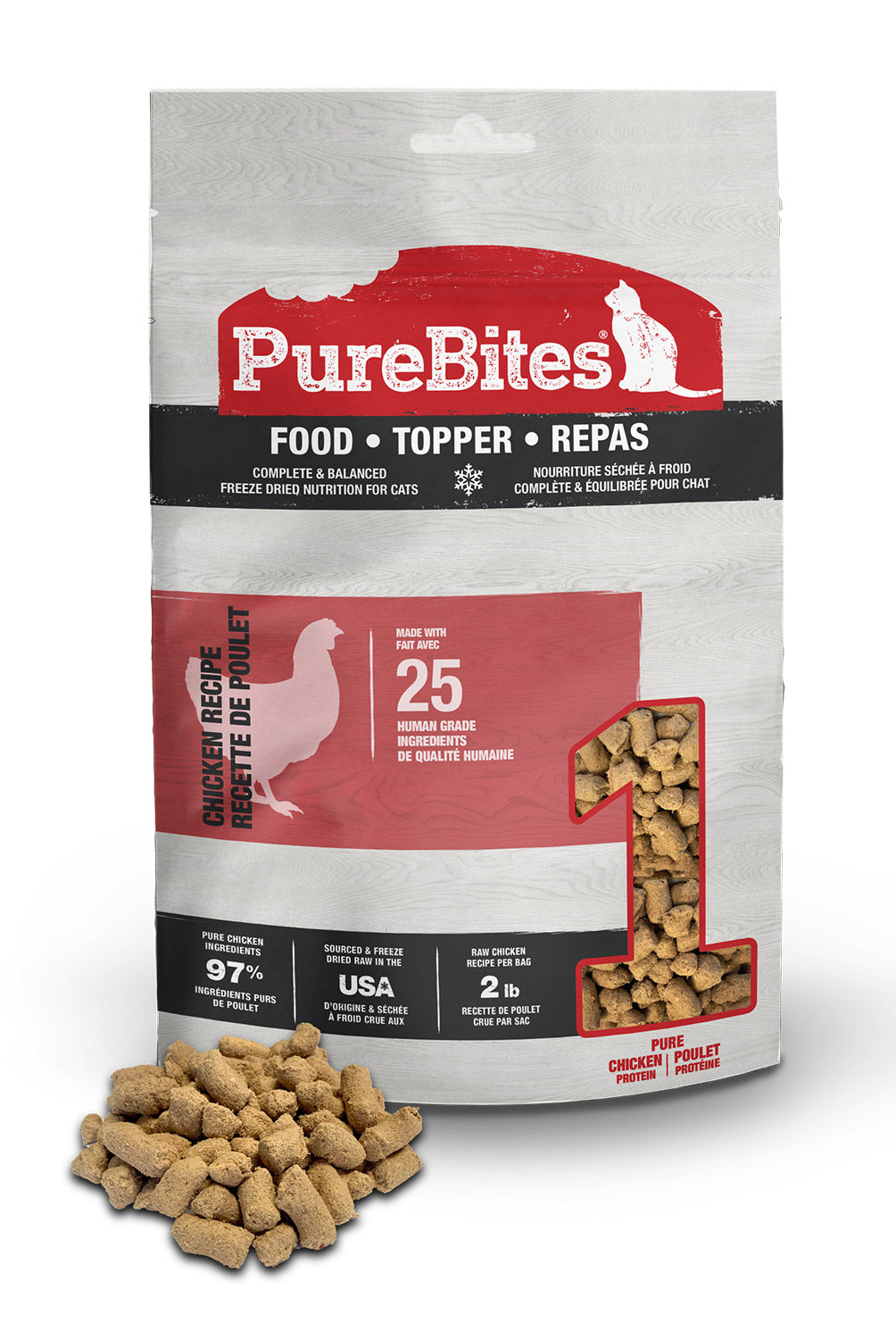 - PureBites® Food/Toppers can be fed as a 100% complete & balanced cat food or as a mixer/ topper for an added RAW protein boost.