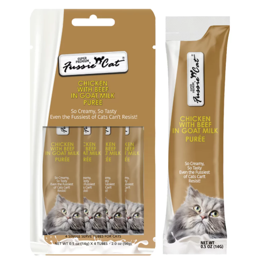 - Our Chicken with Beef in Goat Milk Purée combines hearty chicken and robust beef in a savory goat milk gravy for a treat that’s as comforting as it is nourishing. Each serving is a testament to our commitment to quality, providing your cat with a satisfying and healthy dining experience. Enriched with essential nutrients and the gentle nourishment of goat milk, this formula promotes overall health and well-being. Goat milk is known to support digestion, boost hydration, and soothe inflammation, making it an excellent addition to your cat’s diet. This purée is perfect for cats who enjoy a rich, meaty flavor and a creamy texture, ensuring that treat time is both delicious and beneficial. Ready to delight your feline friend with a premium purée?