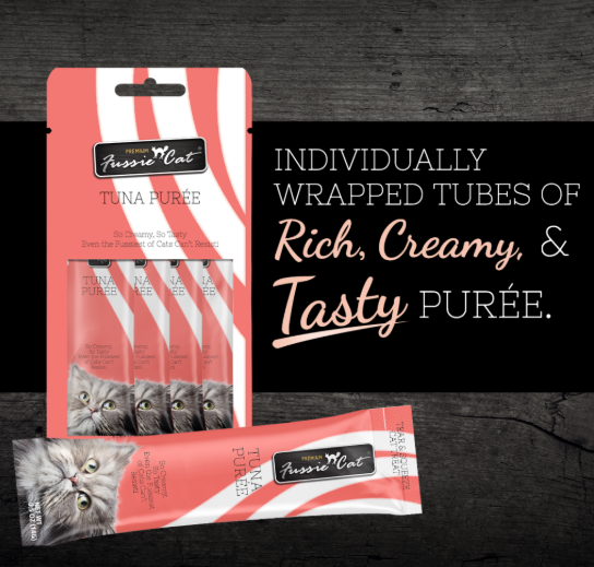 Fussie Cat Tuna Purée is love at first lick. Creamy in texture and rich in taste, this indulgent, flavorsome puree will make even the Fussiest of Cats demand more! Fussie Cat Tuna is an easy-to-feed cat treat with essential vitamin E for your cat’s diet to support healthy skin and coat. Fussie Cat’s secret to a purr-fect purée is that we always use carefully sourced, simple, and wholesome ingredients. Not only delicious but also full of nutritious vitamins and minerals, making it an ideal addition to your cat’s everyday diet. Available in twenty tasty varieties, Fussie Cat Purées are high in the moisture your feline friend needs for a healthy and active life. Add it as a topper to make mealtime exciting and flavorful, or serve it straight out of the tube as a delicious paw-some snack. Feeding time is exciting with our new Fussie Cat Purée Cat Treats!