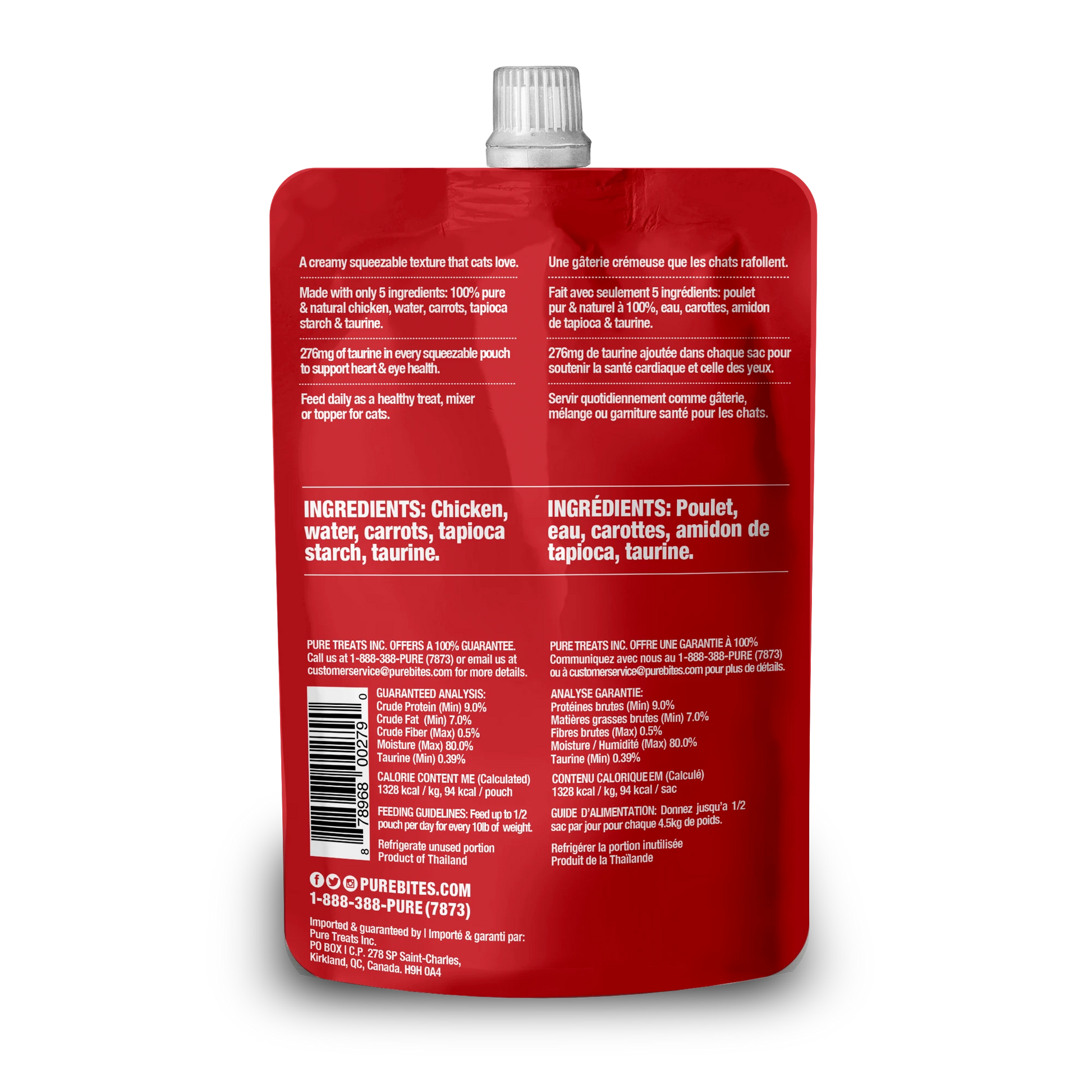 - Ingredients: Chicken, water, carrots, tapioca starch, taurine.