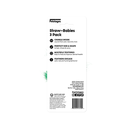 Straw-Babies 3 Pack by Petstages is a delightfully engaging catnip toy your kitty needs! The feathered cat toy contains catnip and crinkle to keep cats engaged in play and activate their natural hunting instincts. Multiple textures help floss to keep teeth clean for good dental health. These berry-sized toys are also perfect for cats to bat at, carry around, and chase!