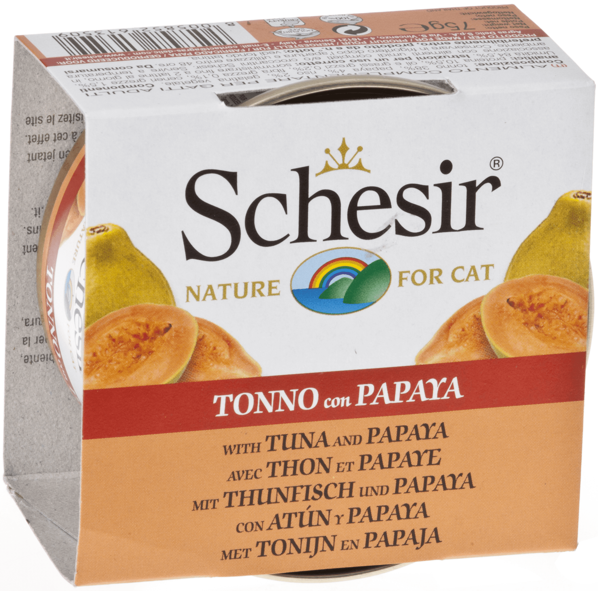 Schesir Tuna Entrée with Papaya is a recipe based on real tuna fillets paired with pieces of appetizing papaya, for an exotic and original meal. Ingredients are prepared in a jelly to satisfy cats who prefer a natural flavour, but with a more compact consistency in the bowl. Schesir was the first company to add real pieces of fruit to its cat food, drawing on the results of a study carried out in collaboration with the Department of Veterinary Medical Sciences – Alma Mater Studiorum University of Bologna, on the positive effects of fruit in a cat’s diet.