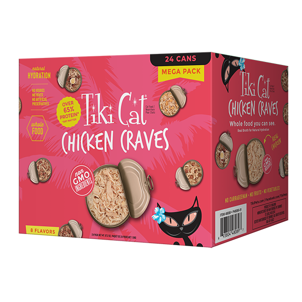 • The ultimate variety pack for chicken-loving cats! The Tiki Cat Chicken Craves Mega Pack is perfect for multi-cat households or those who simply prefer less shopping trips, with 24 servings of the high-protein, high-moisture nutrition cats need as carnivores. 20 servings are Tiki Cat After Dark™ recipes, which feature real chicken and flavorful, nutrient-dense organ meats, and 16 servings are Tiki Cat Luau™ recipes, with shredded chicken in savory consommé.