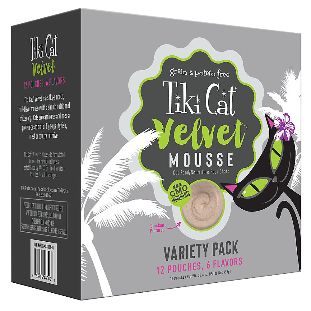 - Tiki Cat Velvet Wet Cat Food features silky-smooth mousse blends of fish or chicken for the most finicky felines.