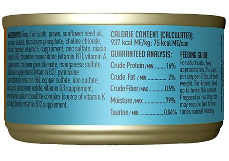 - Ingredients: Tuna, fish broth, prawn, sunflower seed oil, calcium lactate, tricalcium phosphate, choline chloride, fish oil, taurine, vitamin E supplement, zinc sulfate, niacin (vitamin B3), thiamine mononitrate (vitamin B1), vitamin A supplement, calcium pantothenate, manganese sulfate, riboflavin supplement (vitamin B2), pyridoxine hydrochloride (vitamin B6), copper sulfate, iron sulfate, folic acid, potassium iodide, vitamin D3 supplement, menadione sodium bisulfite complex (source of vitamin K activity), biotin, vitamin B12 supplement.