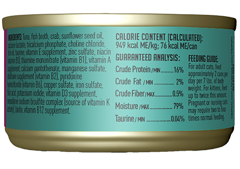 - Ingredients: Tuna, fish broth, crab, sunflower seed oil, calcium lactate, tricalcium phosphate, choline chloride, fish oil, taurine, vitamin E supplement, zinc sulfate, niacin (vitamin B3), thiamine mononitrate (vitamin B1), vitamin A supplement, calcium pantothenate, manganese sulfate, riboflavin supplement (vitamin B2), pyridoxine hydrochloride (vitamin B6), copper sulfate, iron sulfate, folic acid, potassium iodide, vitamin D3 supplement, menadione sodium bisulfite complex (source of vitamin K activity), biotin, vitamin B12 supplement.