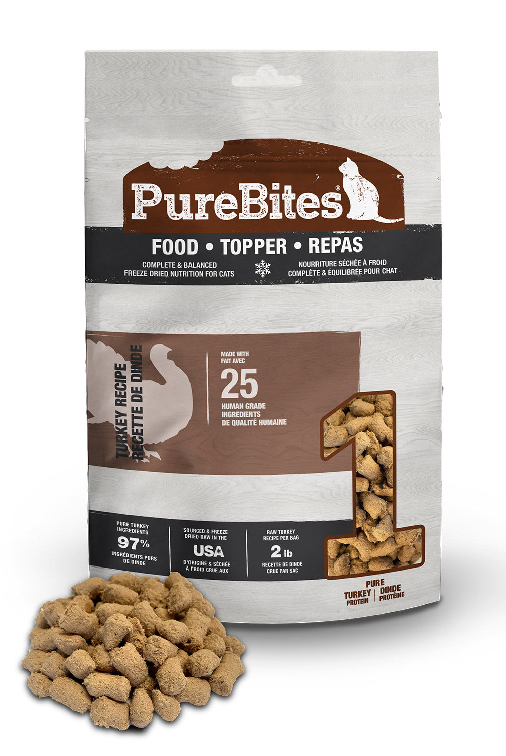 - PureBites® Food/Toppers can be fed as a 100% complete & balanced cat food or as a mixer/ topper for an added RAW protein boost.