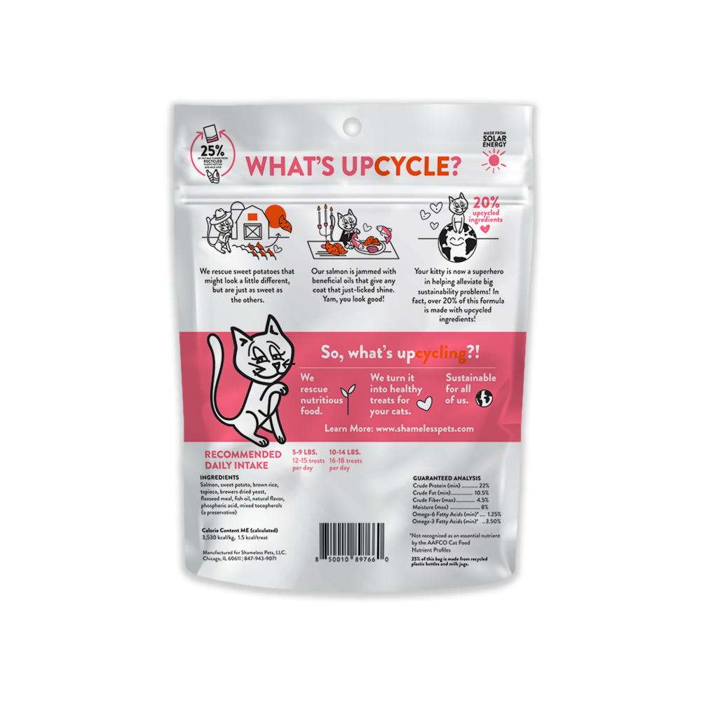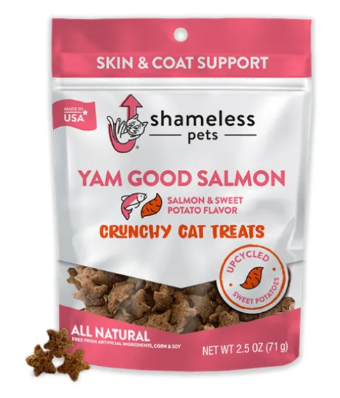 - These crunchy, star-shaped, bite-sized treats are made with salmon and sweet potatoes, with added fish oils for that extra skin & coat support, your cat will be lookin' good and feelin' good.